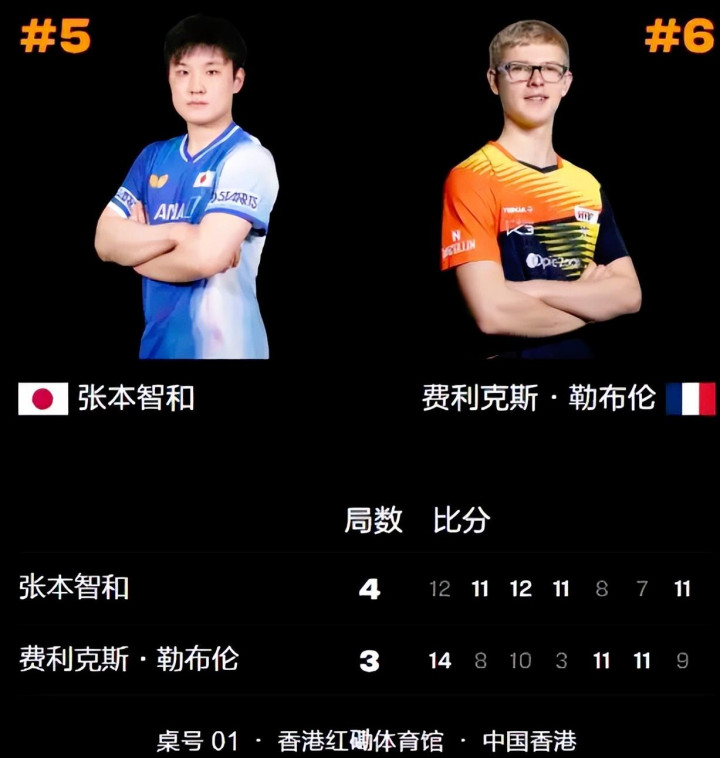 张本智和与勒布伦的对决堪称“破冰之战”。此前五次交手勒布伦全胜,是张本的“头号克星”。此次世界第五的张本携“冲冠争第一”的野心,迎战手握奥运铜牌的世界第六勒布伦,火药味拉满。